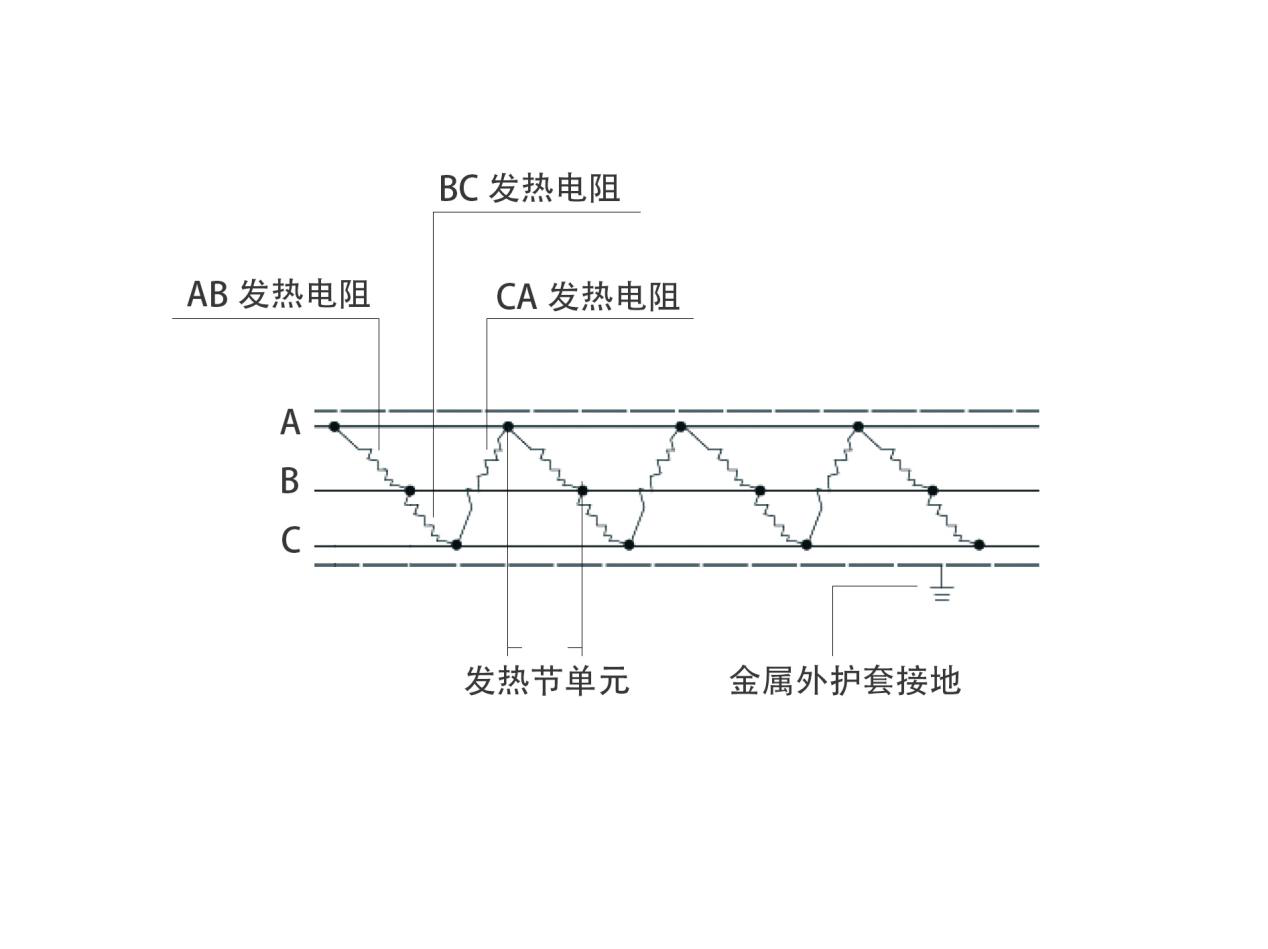三根相互平行包覆在絕緣層中的鍍錫銅絞線,作為電源母線,并在其外表加覆一層絕緣層作為內(nèi)護(hù)套層,在其表面纏繞電阻絲,電阻絲每隔一定的距離(發(fā)熱節(jié))與母線連接,形成連續(xù)并聯(lián)電阻,母線通電后,各并聯(lián)電阻發(fā)熱,因而形成一條連續(xù)發(fā)熱的電伴熱帶?扇我饧羟;金屬編制層(需接地)在提高抗拉強(qiáng)度的同時(shí)也避免了靜電的產(chǎn)生。